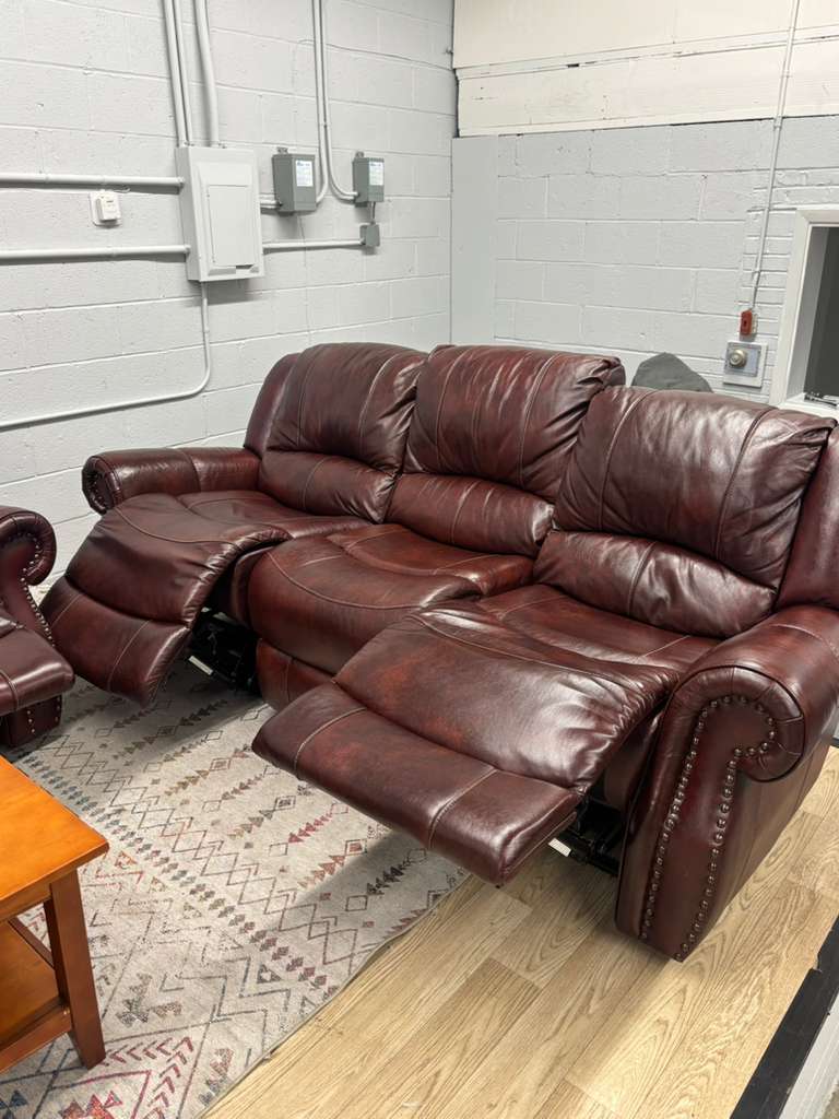 This leather sofa set is very comfortable and easy to use. The seats recline with the push of a button, and the headrests move for extra comfort. The leather looks great with light wear from normal use. Perfect for a living room or family room.