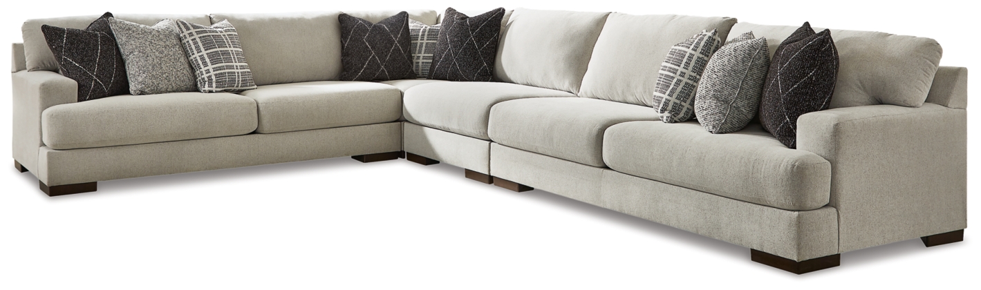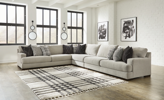 This sectional is a beautiful case of oversized space?fully utilized. Its generous scale ensures that everyone has a place to kick back and relax in style. Stunning in light gray, its cool color is only part of the story, a bevy of black and white accent pillows ensures a happy landing for everyone.