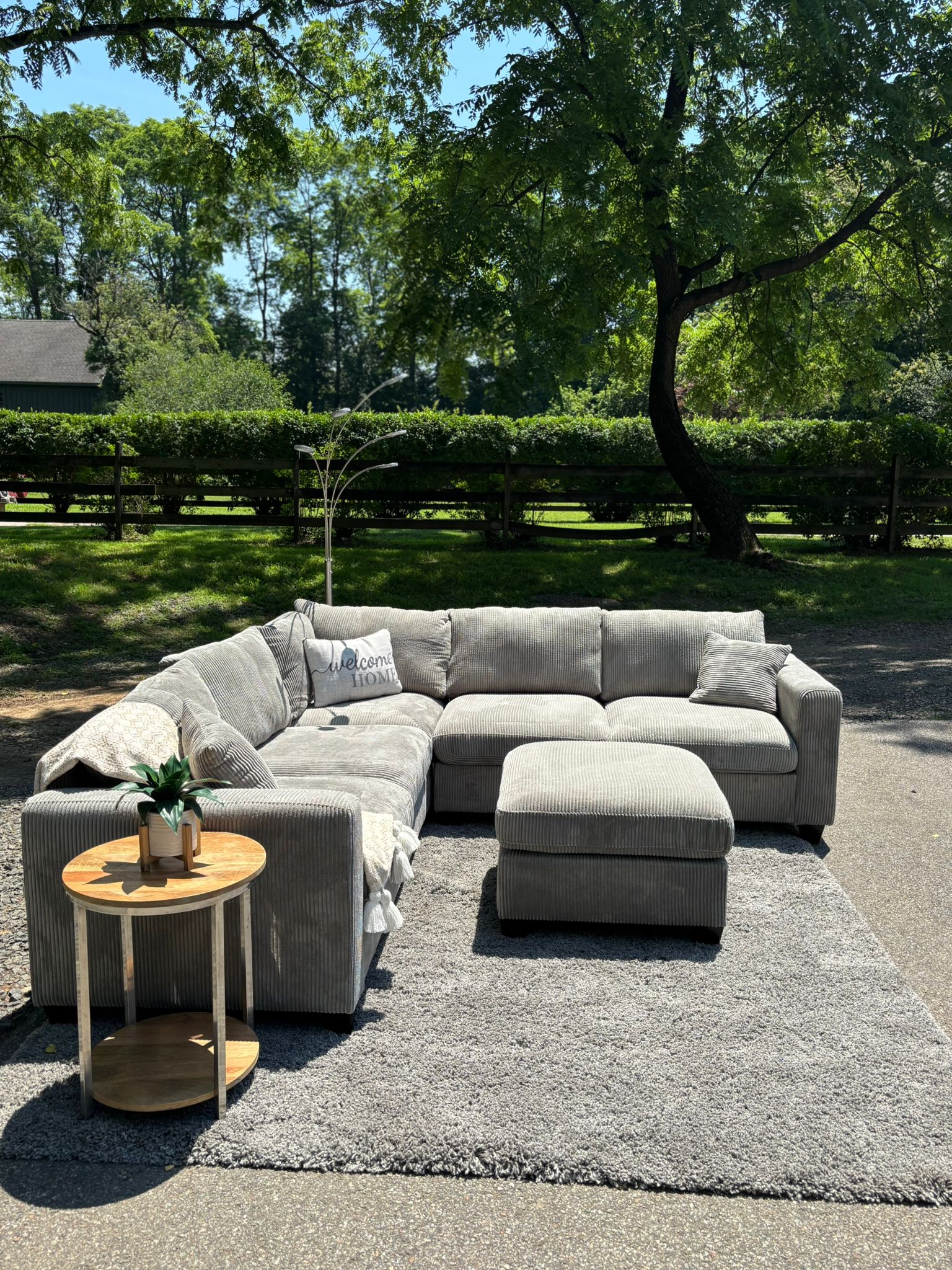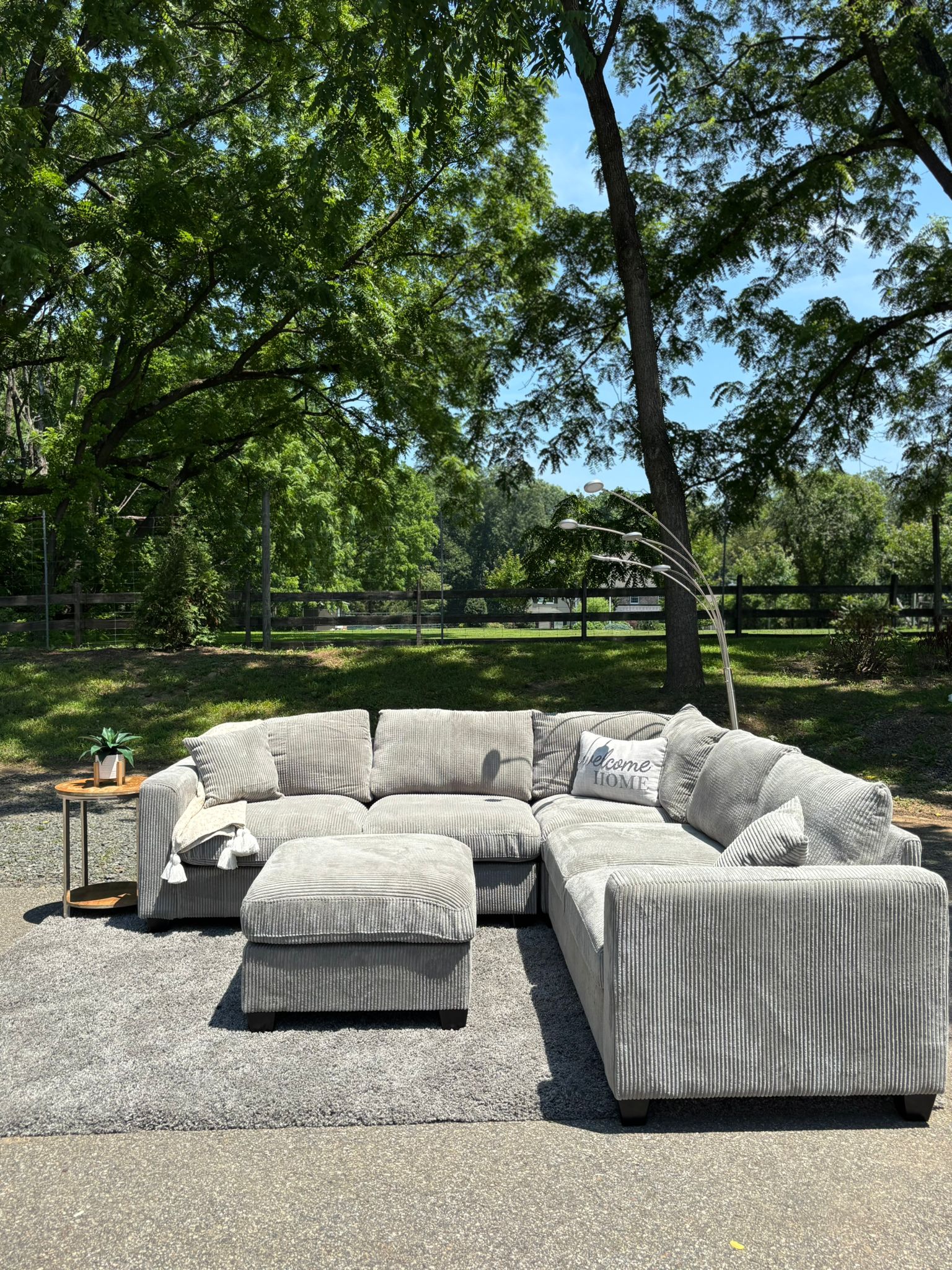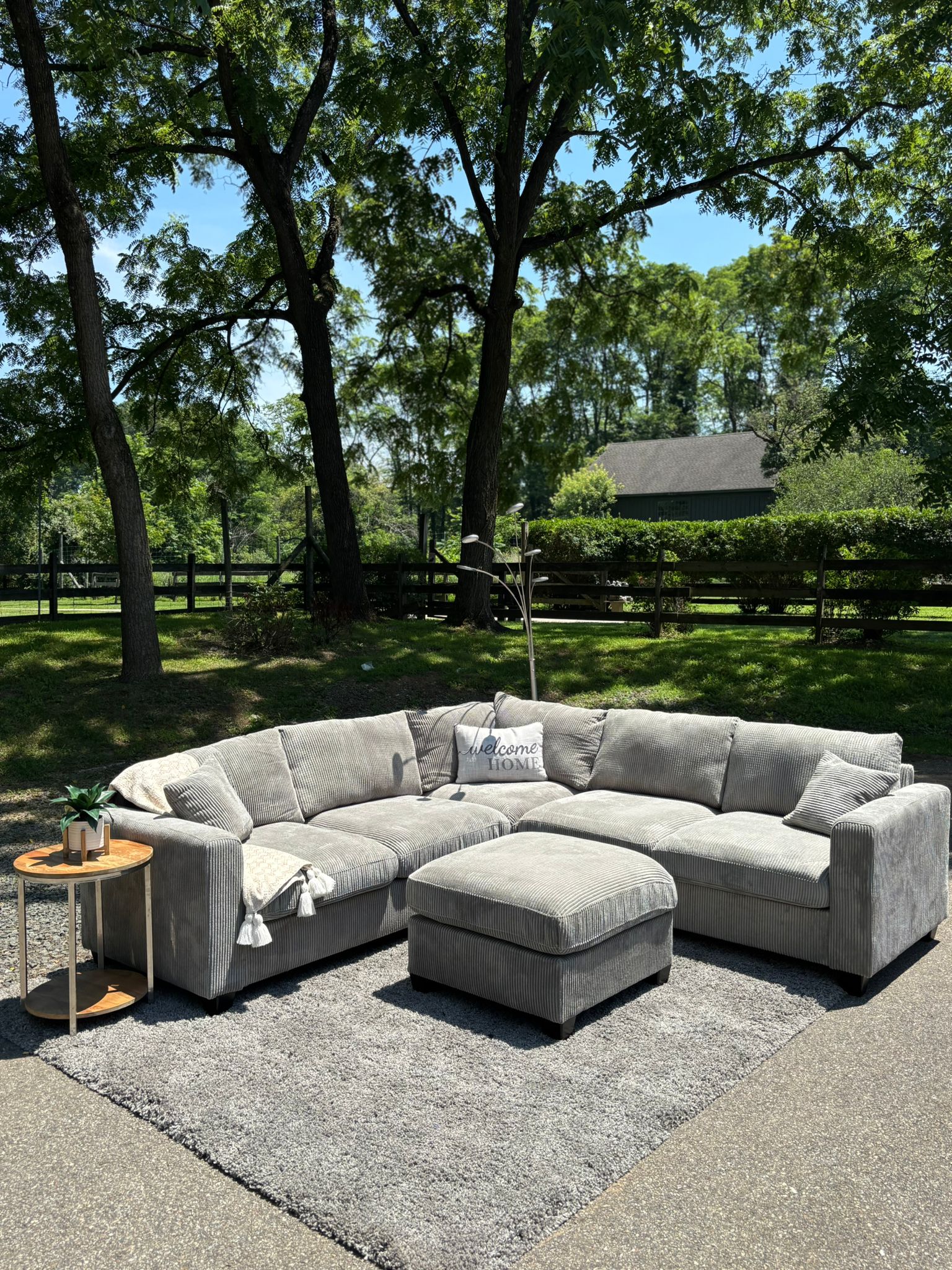 This BRAND NEW Harlow sectional is the definition of lounge luxury. Built with plush corduroy-style fabric, deep seats, and a matching oversized ottoman, it’s perfect for Netflix binges, game nights, or falling asleep mid-text.