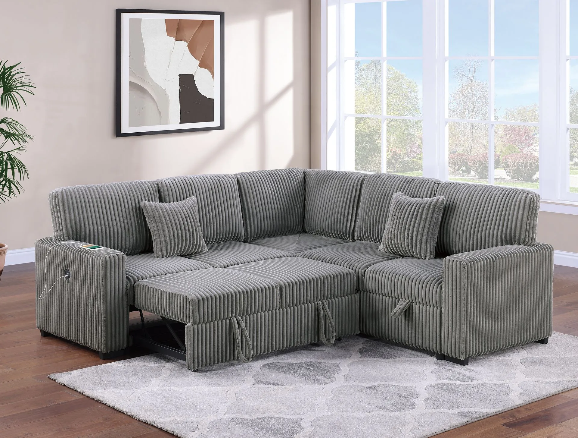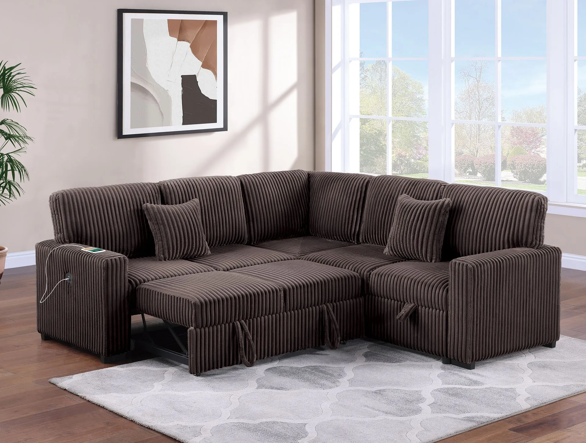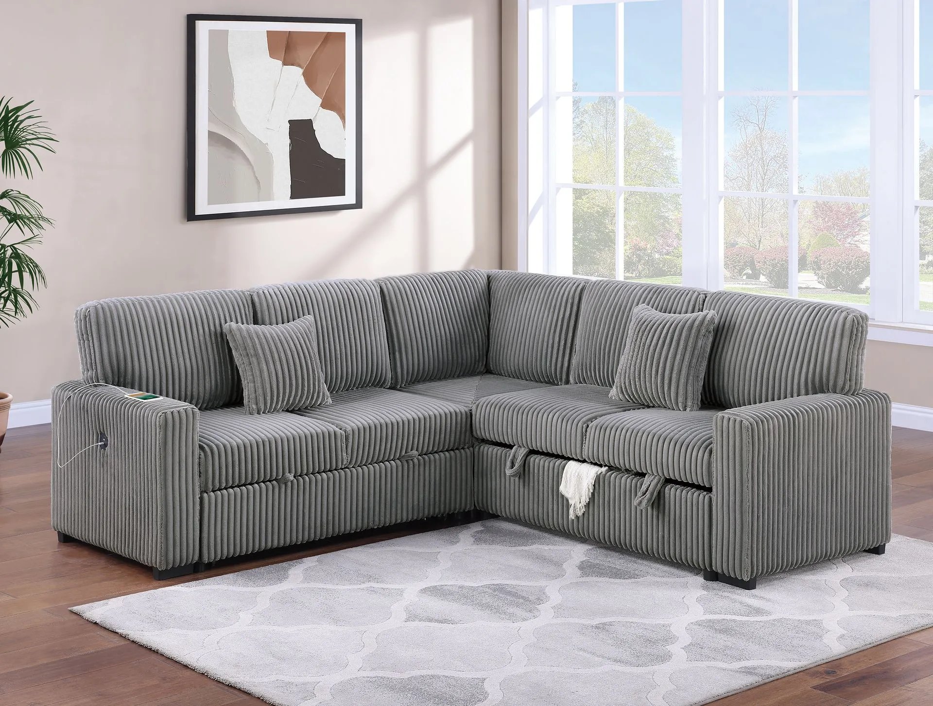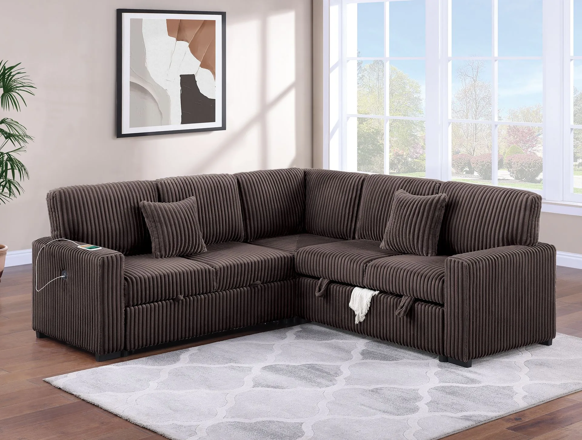This space-saving L-shaped sectional is designed for comfort, storage, and overnight flexibility, featuring soft fur-like corduroy, a pull-out sleeper, and hidden storage so you can relax, stay organized, and host guests without needing extra furniture.