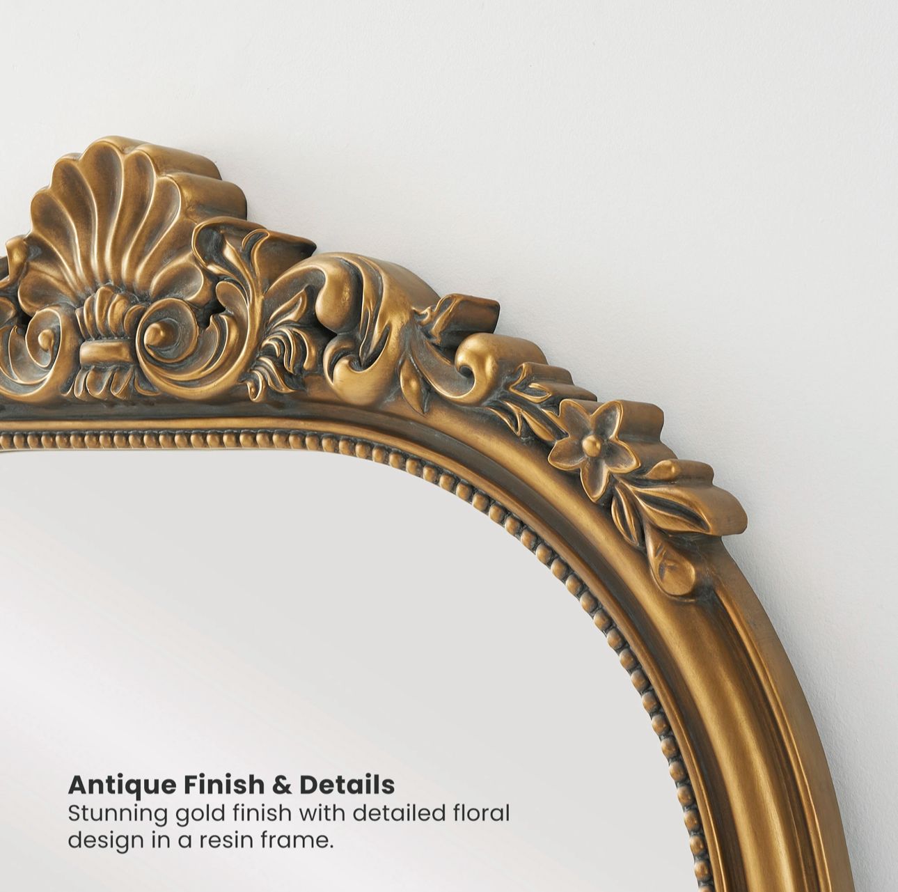 This elegant, antique-finish floor mirror features a detailed resin frame, mirrored glass, and timeless style — perfect for elevating bedrooms, entryways, or living spaces.