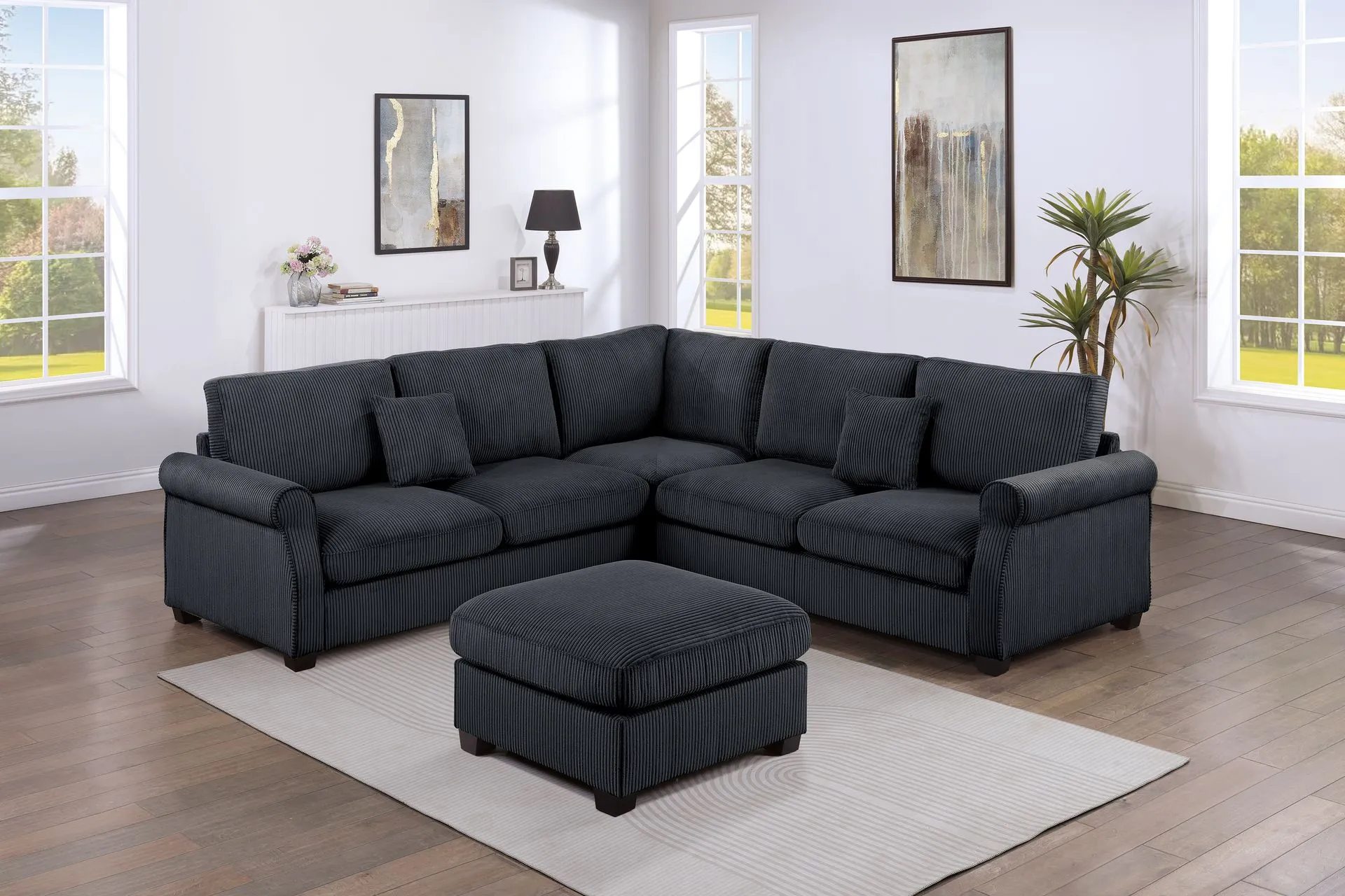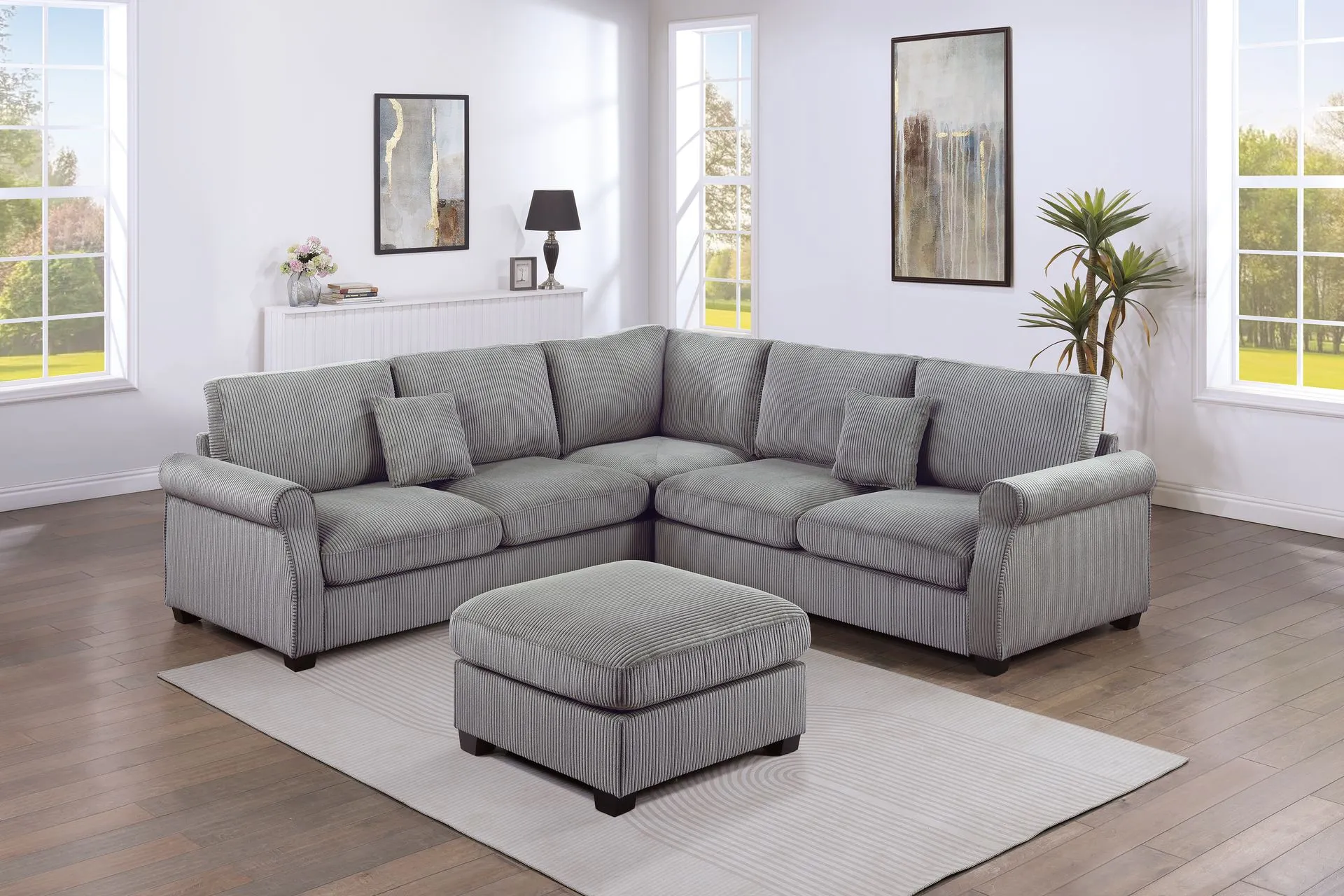 This inviting L-shaped sectional is made for gathering, lounging, and everyday comfort. Wrapped in ultra-soft corduroy with a warm, cozy feel, it features low-profile legs for a clean modern look and includes two loveseats, a corner wedge, and a matching ottoman so everyone has a place to relax.